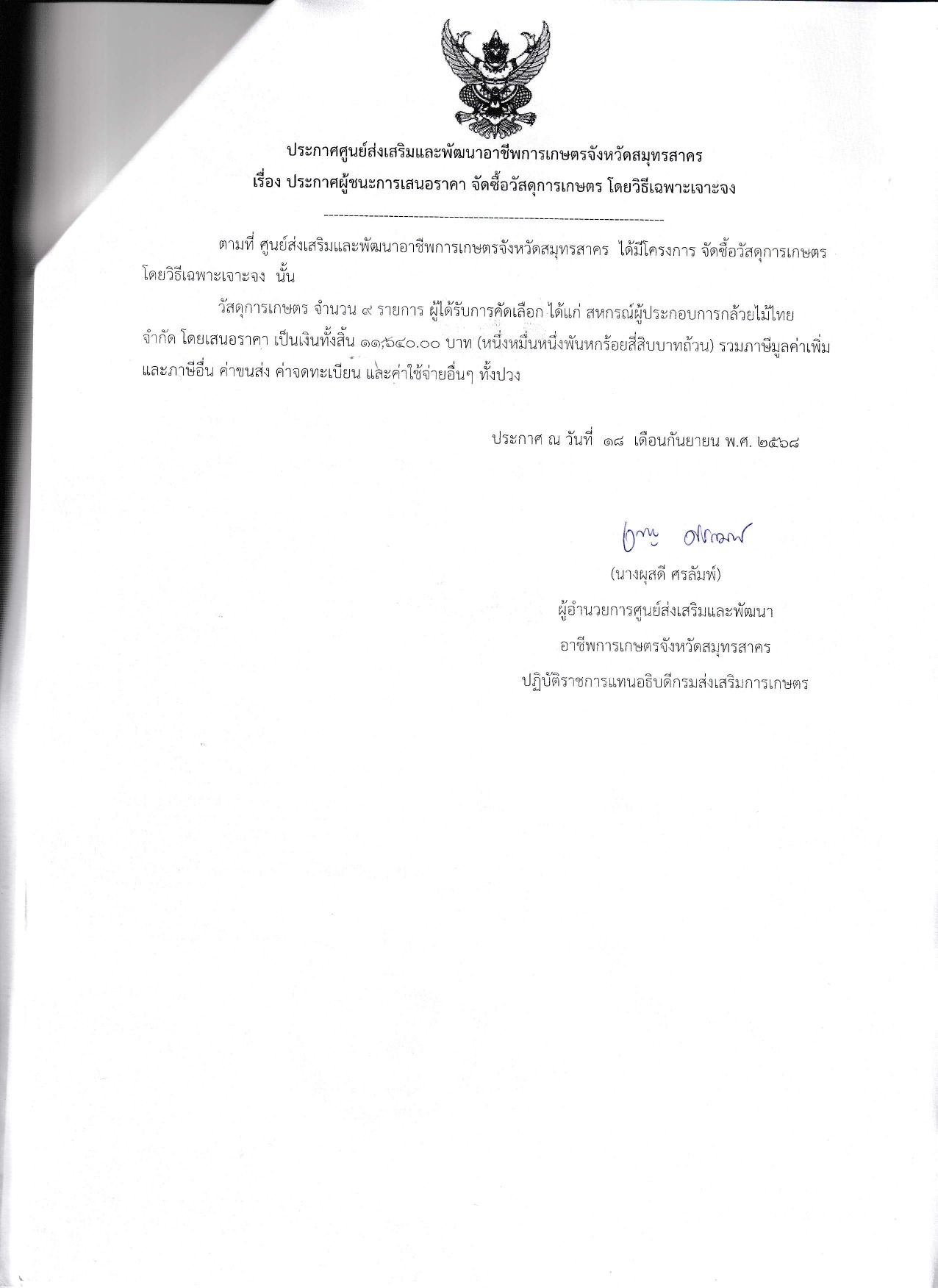ประกาศผู้ชนะการเสนอราคา จัดซื้อวัสดุการเกษตร โดยวิธีเฉพาะเจาะจง (ประกาศ ณ วันที่ 18 กันยายน 2568)
