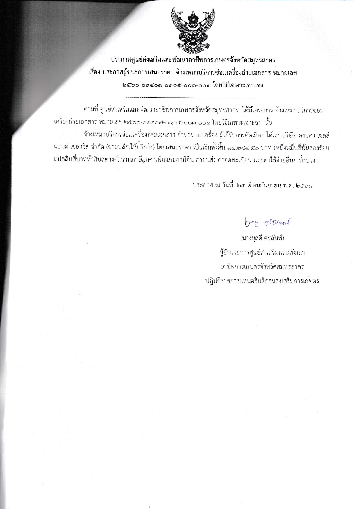 ประกาศผู้ชนะการเสนอราคา จ้างเหมาบริการซ่อมเครื่องถ่ายเอกสาร หมายเลข 2560-01407-0105-003-001 โดยวิธีเฉพาะเจาะจง (ประกาศ ณ วันที่ 24 กันยายน 2568)