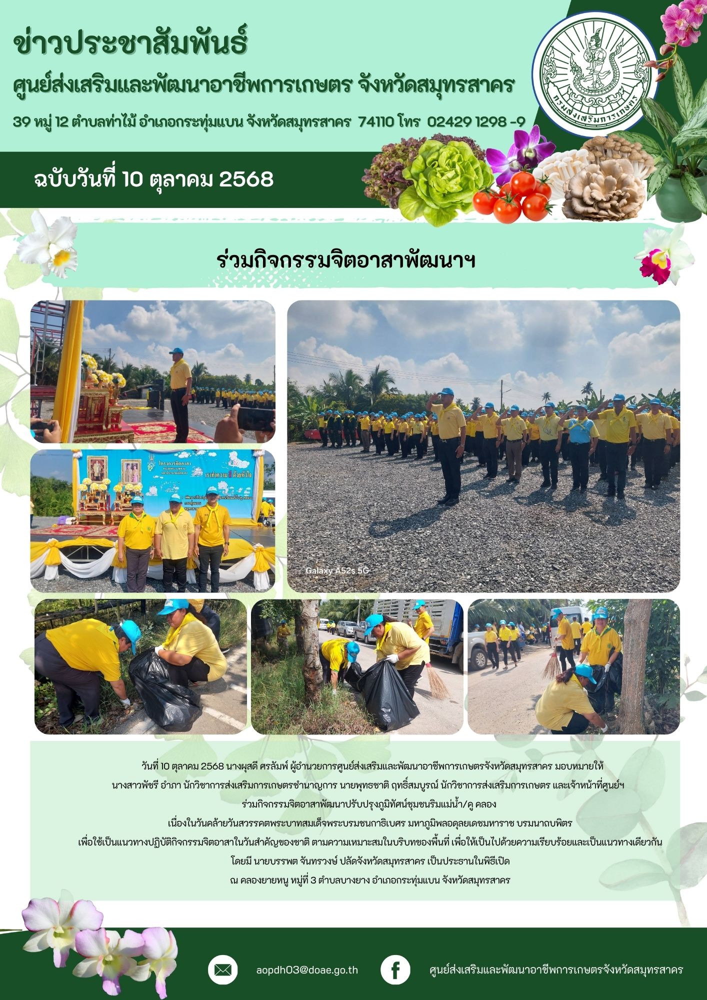 วันที่ 10 ตค. 68 นางผุสดี ศรลัมพ์ ผู้อำนวยการศูนย์ฯ มอบหมายให้ นส.พัชรี อำภา นวส.ชำนาญการ นายพุทธชาติ ฤทธิ์สมบูรณ์ นวส. และเจ้าหน้าที่ศูนย์ฯ ร่วมกิจกรรมจิตอาสาพัฒนาปรับปรุงภูมิทัศน์ชุมชนริมแม่น้ำ/คู คลอง เนื่องในวันคล้ายวันสวรรคตพระบาทสมเด็จพระบรมชนกาธิเบศร มหาภูมิพลอดุลยเดชมหาราช บรมนาถบพิตร เพื่อใช้เป็นแนวทางปฏิบัติกิจกรรมจิตอาสาในวันสำคัญของชาติ ตามความเหมาะสมในบริบทของพื้นที่ เพื่อให้เป็นไปด้วยความเรียบร้อยและเป็นแนวทางเดียวกัน โดยมี นายบรรพต จันทรวงษ์ ปลัดจังหวัดสมุทรสาคร เป็นประธานในพิธีเปิด