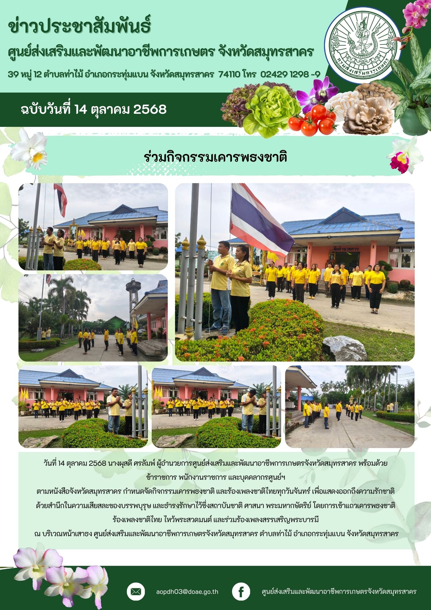 วันที่ 14 ตค. 68 นางผุสดี ศรัมพ์ ผู้อำนวยการศูนย์ฯ พร้อมด้วย ข้าราชการ พนักงานราชการ และบุคคลากรศูนย์ฯ ตามหนังสือจังหวัดสมุทรสาคร กำหนดจัดกิจกรรมเคารพธงชาติ และร้องเพลงชาติไทยทุกวันจันทร์ เพื่อแสดงออกถึงความรักชาติ ด้วยสำนึกในความเสียสละของบรรพบุรุษ และธำรงรักษาไว้ซึ่งสถาบันชาติ ศาสนา พระมหากษัตริย์ โดยการเข้าแถวเคารพธงชาติ ร้องเพลงชาติไทย ไหว้พระสวดมนต์ และร่วมร้องเพลงสรรเสริญพระบารมี