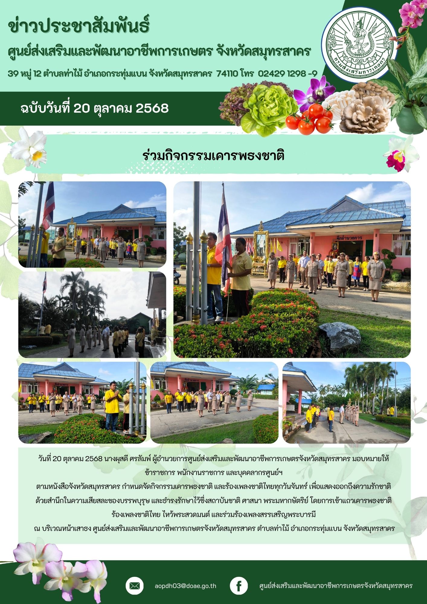 วันที่ 20 ตค. 68 นางผุสดี ศรลัมพ์ ผู้อำนวยการศูนย์ฯ มอบหมายให้ ข้าราชการ พนักงานราชการ และบุคคลากรศูนย์ฯ ตามหนังสือจังหวัดสมุทรสาคร กำหนดจัดกิจกรรมเคารพธงชาติ และร้องเพลงชาติไทยทุกวันจันทร์ เพื่อแสดงออกถึงความรักชาติ ด้วยสำนึกในความเสียสละของบรรพบุรุษ และธำรงรักษาไว้ซึ่งสถาบันชาติ ศาสนา พระมหากษัตริย์ โดยการเข้าแถวเคารพธงชาติ ร้องเพลงชาติไทย ไหว้พระสวดมนต์ และร่วมร้องเพลงสรรเสริญพระบารมี