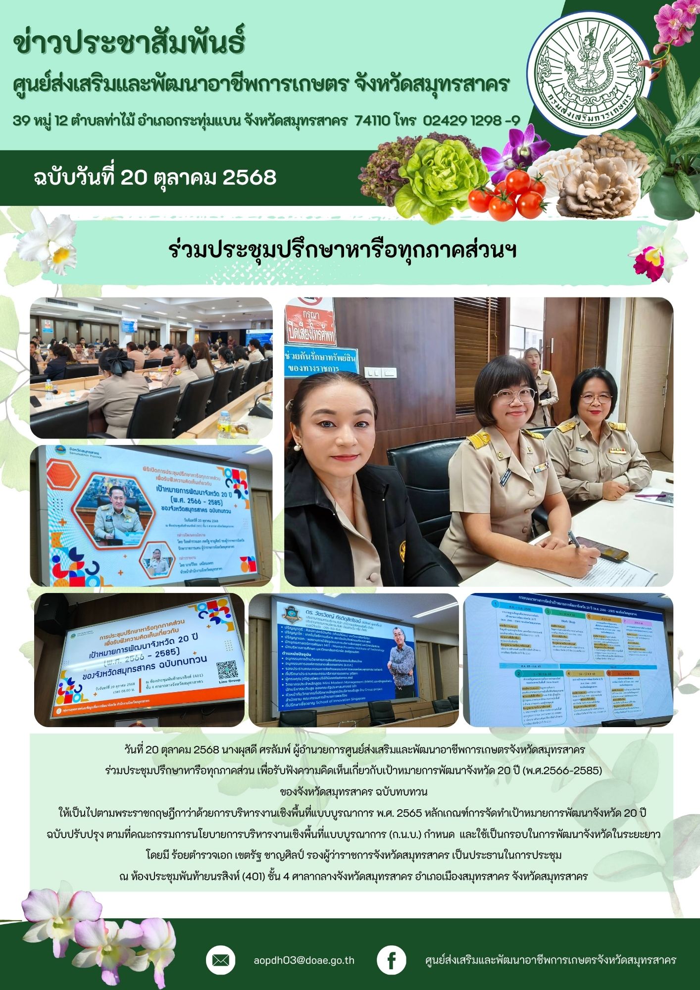 วันที่ 20 ตค. 68 นางผุสดี ศรลัมพ์ ผู้อำนวยการศูนย์ฯ ร่วมประชุมปรึกษาหารือทุกภาคส่วน เพื่อรับฟังความคิดเห็นเกี่ยวกับเป้าหมายการพัฒนาจังหวัด 20 ปี (พ.ศ.2566-2585) ของจังหวัดสมุทรสาคร ฉบับทบทวน ให้เป็นไปตามพระราชกฤษฎีกาว่าด้วยการบริหารงานเชิงพื้นที่แบบบูรณาการ พ.ศ. 2565 หลักเกณฑ์การจัดทำเป้าหมายการพัฒนาจังหวัด 20 ปี ฉบับปรับปรุง ตามที่คณะกรรมการนโยบายการบริหารงานเชิงพื้นที่แบบบูรณาการ (ก.น.บ.) กำหนด และใช้เป็นกรอบในการพัฒนาจังหวัดในระยะยาว โดยมี ร้อยตำรวจเอก เขตรัฐ ชาญศิลป์ รองผู้ว่าราชการจังหวัดสมุทรสาคร เป็นประธานในการประชุม