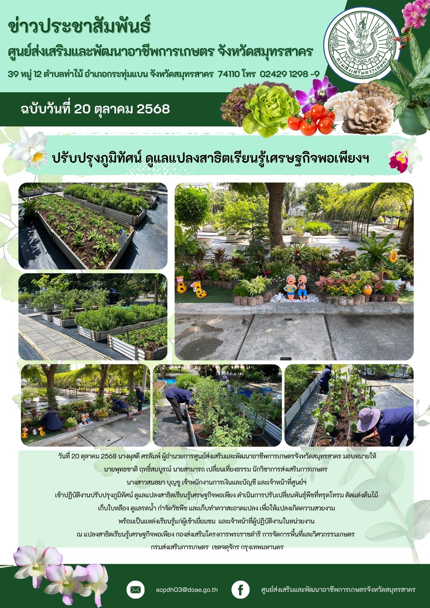 วันที่ 20 ตค. 68 นางผุสดี ศรลัมพ์ ผู้อำนวยการศูนย์ฯ มอบหมายให้ นายพุทธชาติ ฤทธิ์สมบูรณ์ นายสามารถ เปลี่ยนเที่ยงธรรม นักวิชาการส่งเสริมการเกษตร นางสาวสนธยา บุญชู เจ้าพนักงานการเงินและบัญชี และเจ้าหน้าที่ศูนย์ฯ เข้าปฏิบัติงานปรับปรุงภูมิทัศน์ ดูแลแปลงสาธิตเรียนรู้เศรษฐกิจพอเพียง ดำเนินการปรับเปลี่ยนพันธุ์พืชที่ทรุดโทรม ตัดแต่งต้นไม้ เก็บใบหลือง ดูแลรดน้ำ กำจัดวัชพืช และเก็บทำควาสะอาดแปลง เพื่อให้แปลงเกิดความสวยงาม พร้อมเป็นแหล่งเรียนรู้แก่ผู้เข้าเยี่ยมชม และเจ้าหน้าที่ผู้ปฏิบัติงานในหน่วยงาน