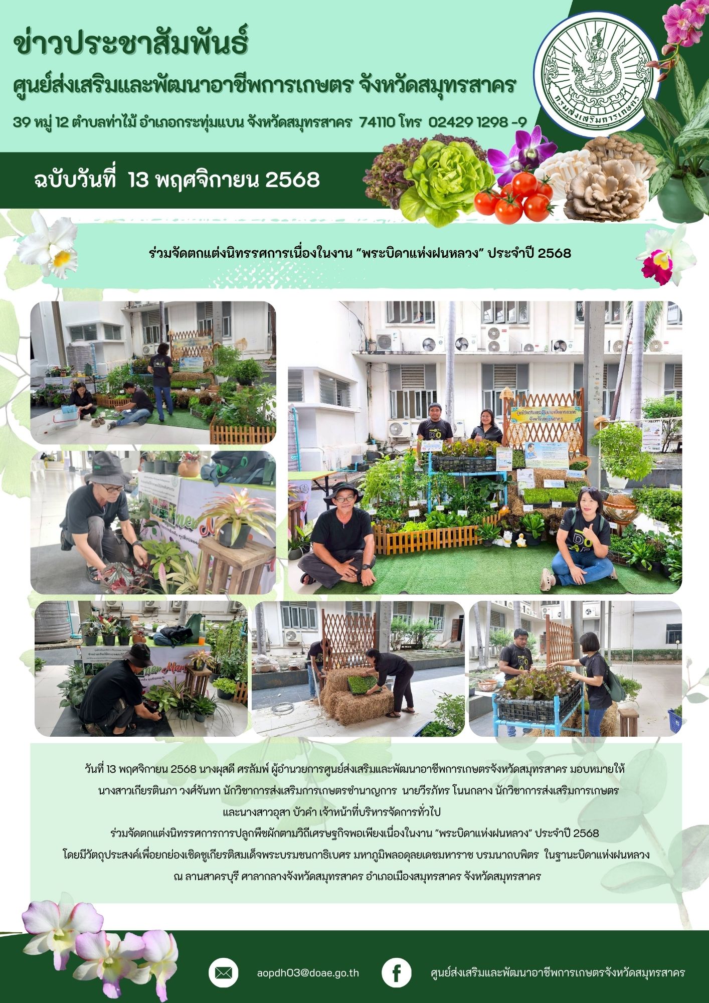 วันที่ 13 พย. 68 นางผุสดี ศรลัมพ์ ผู้อำนวยการศูนย์ฯ มอบหมายให้ นส.เกียรตินภา วงศ์จันทา นวส.ชำนาญการ นายวีรภัทร โนนกลาง นวส. และนส.อุสา บัวคำ จนท.บริหารจัดการทั่วไป ร่วมจัดตกแต่งนิทรรศการการปลูกพืชผักตามวิถีเศรษฐกิจพอเพียงเนื่องในงาน “พระบิดาแห่งฝนหลวง” ประจำปี 2568 โดยมีวัตถุประสงค์เพื่อยกย่องเชิดชูเกียรติสมเด็จพระบรมชนกาธิเบศร มหาภูมิพลอดุลยเดชมหาราช บรมนาถบพิตร ในฐานะบิดาแห่งฝนหลวง