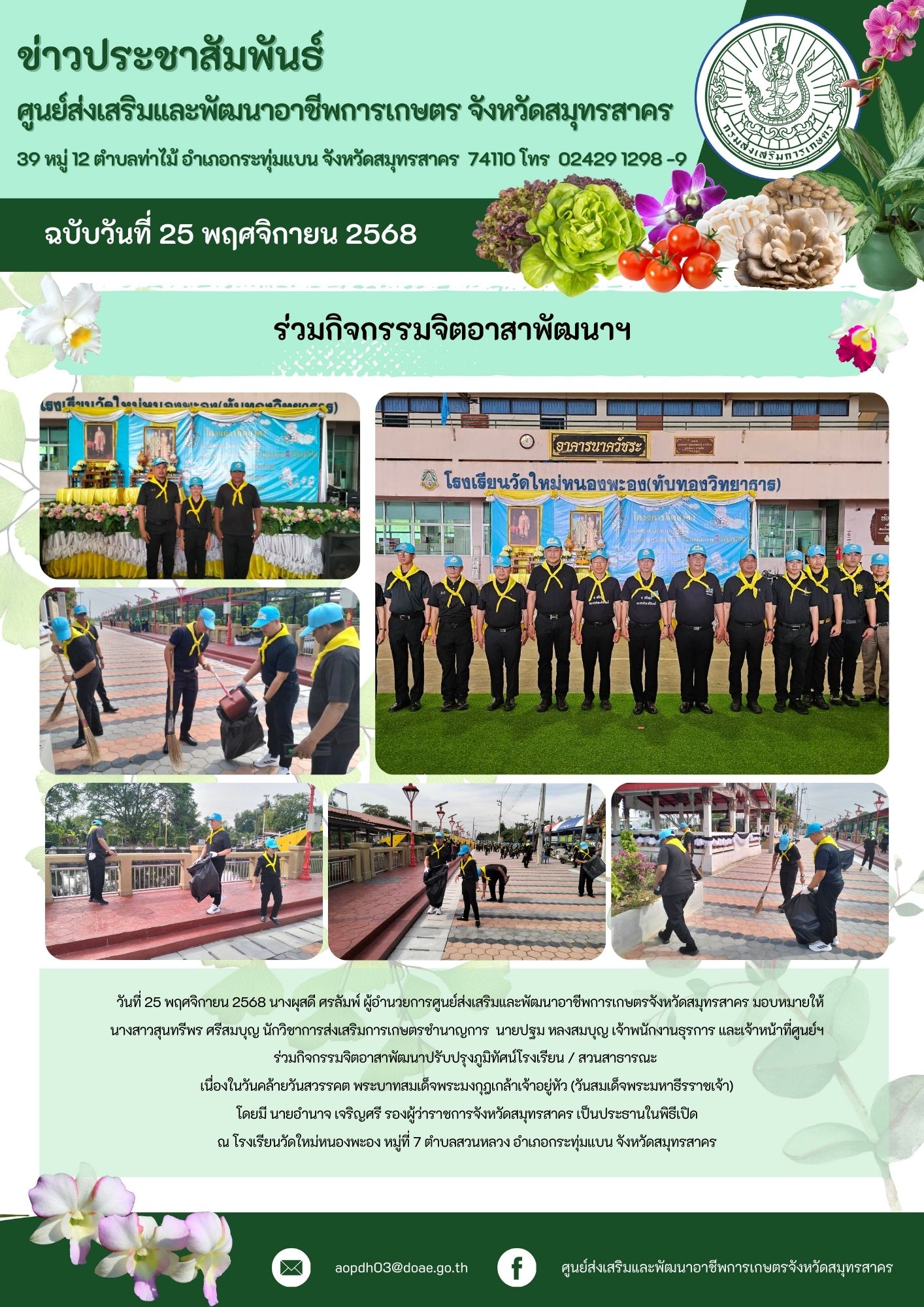 วันที่ 25 พย. 68 นางผุสดี ศรลัมพ์ ผู้อำนวยการศูนย์ฯ มอบหมายให้ นส.สุนทรีพร ศรีสมบุญ นวส.ชำนาญการ นายปฐม หลงสมบุญ จพง.ธุรการ และเจ้าหน้าที่ศูนย์ฯ ร่วมกิจกรรมจิตอาสาพัฒนาปรับปรุงภูมิทัศน์โรงเรียน / สวนสาธารณะ เนื่องในวันคล้ายวันสวรรคต พระบาทสมเด็จพระมงกุฎเกล้าเจ้าอยู่หัว (วันสมเด็จพระมหาธีรราชเจ้า) โดยมี นายอำนาจ เจริญศรี รองผู้ว่าราชการจังหวัดสมุทรสาคร เป็นประธานในพิธีเปิด