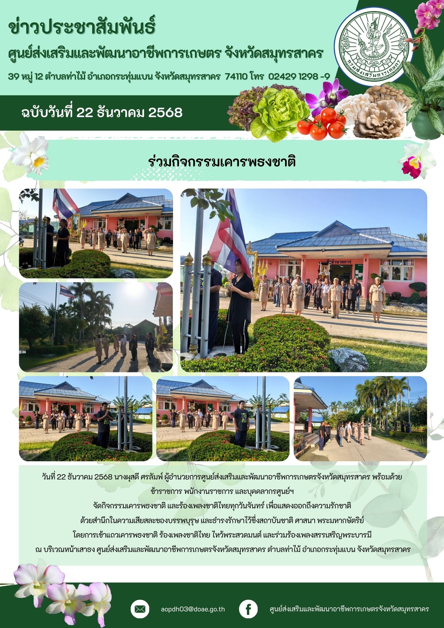 - วันที่ 24 พย. 68 นางผุสดี ศรลัมพ์ ผู้อำนวยการศูนย์ฯ มอบหมายให้ ข้าราชการ พนักงานราชการ และบุคคลากรศูนย์ฯ ตามหนังสือจังหวัดสมุทรสาคร กำหนดจัดกิจกรรมเคารพธงชาติ และร้องเพลงชาติไทยทุกวันจันทร์ เพื่อแสดงออกถึงความรักชาติ ด้วยสำนึกในความเสียสละของบรรพบุรุษ และธำรงรักษาไว้ซึ่งสถาบันชาติ ศาสนา พระมหากษัตริย์ โดยการเข้าแถวเคารพธงชาติ ร้องเพลงชาติไทย ไหว้พระสวดมนต์ และร่วมร้องเพลงสรรเสริญพระบารมี