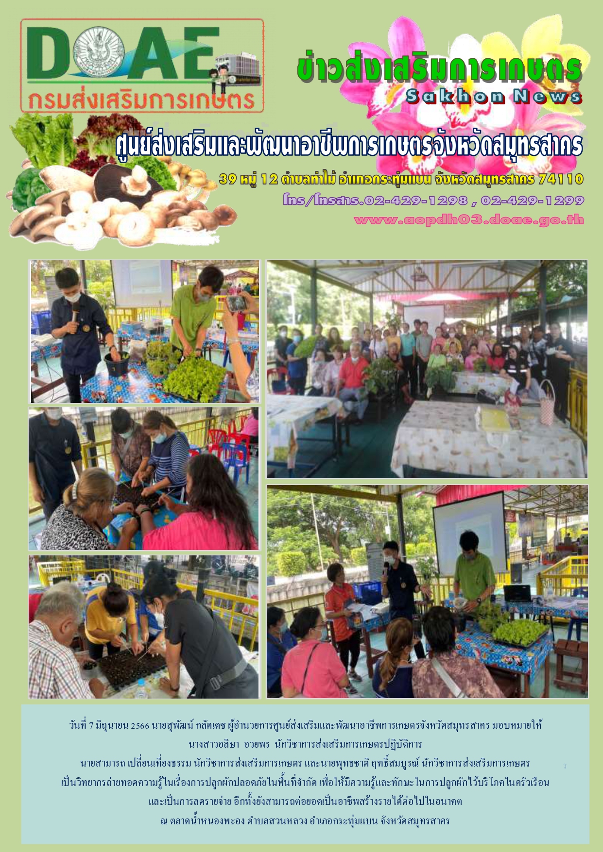 วันที่ 7 มิย. 66 นายสุพัฒน์ กลัดเดช ผู้อำนวยการศูนย์ฯ มอบหมายให้ นส.อลิษา อวยพร นวส.ปฏิบัติการ นายสามารถ เปลี่ยนเที่ยงธรรม นวส. และนายพุทธชาติ ฤทธิ์สมบูรณ์ นวส. เป็นวิทยากรถ่ายทอดความรู้ในเรื่องการปลูกผักปลอดภัยในพื้นที่จำกัดฯลฯ