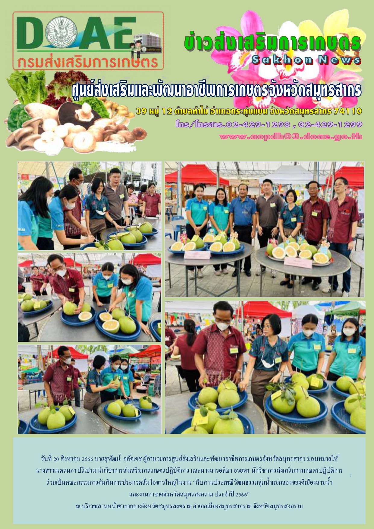 วันที่ 20 สค. 66 นายสุพัฒน์ กลัดเดช ผู้อำนวยการศูนย์ฯ มอบหมายให้ นส.เนตรนภา ปรีเปรม นวส.ปฏิบัติการ และนส.อลิษา อวยพร นวส.ปฏิบัติการ ร่วมเป็นคณะกรรมการตัดสินการประกวดส้มโอขาวใหญ่ในงาน “สืบสานประเพณีวัฒนธรรมลุ่มน้ำแม่กลองของดีเมืองสามน้ำ และงานกาชาดจังหวัดสมุทรสงคราม ประจำปี 2566”