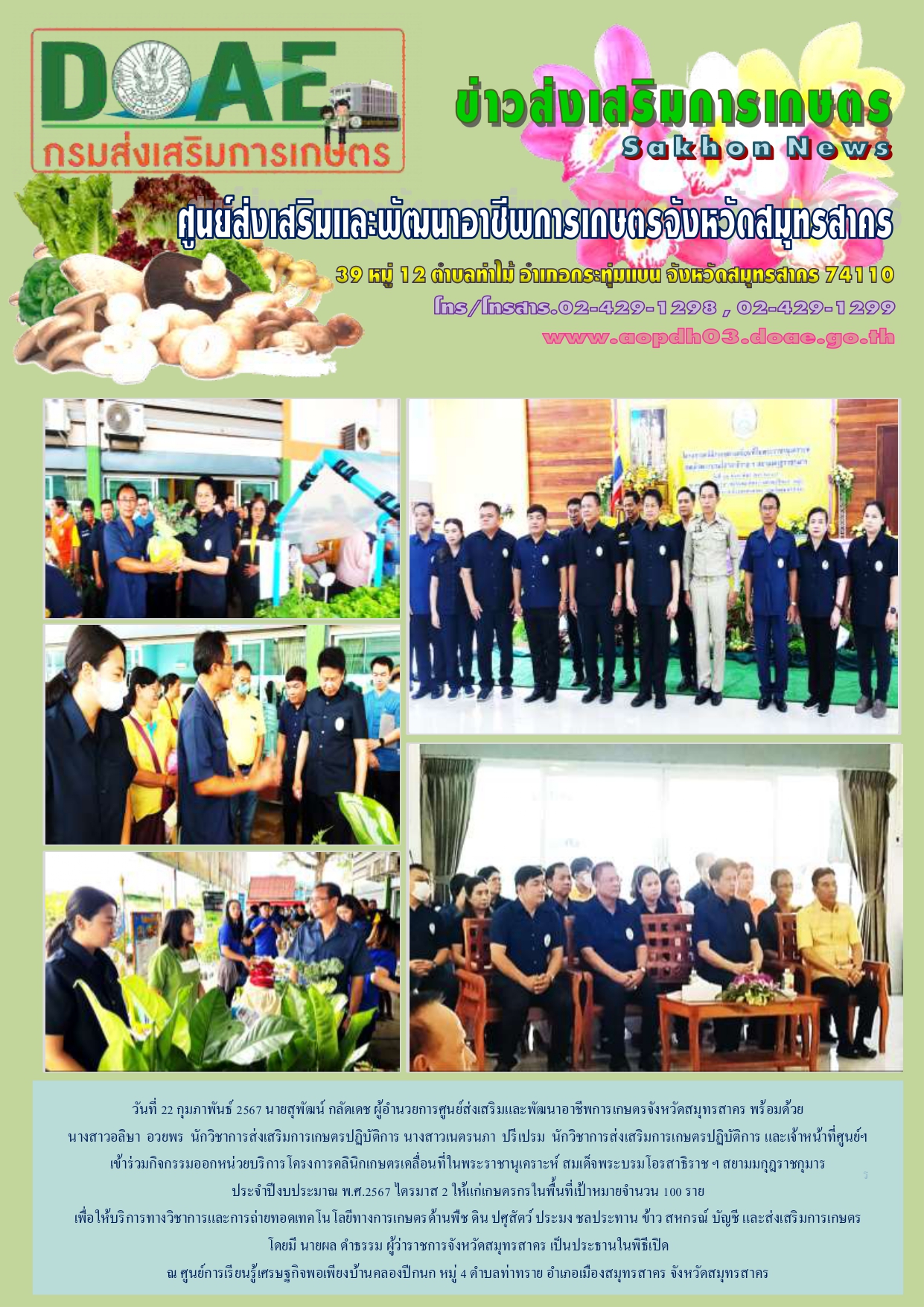 วันที่ 22 กพ. 67 นายสุพัฒน์ กลัดเดช ผู้อำนวยการศูนย์ฯ พร้อมด้วย นส.อลิษา อวยพร นวส.ปฏิบัติการ นส.เนตรนภา ปรีเปรม นวส.ปฏิบัติการ และเจ้าหน้าที่ศูนย์ฯ เข้าร่วมกิจกรรมออกหน่วยบริการโครงการคลินิกเกษตรเคลื่อนที่ในพระราชานุเคราะห์ สมเด็จพระบรมโอรสาธิราช ฯ สยามมกุฎราชกุมาร ประจำปีงบประมาณ พ.ศ.2567 ไตรมาส 2