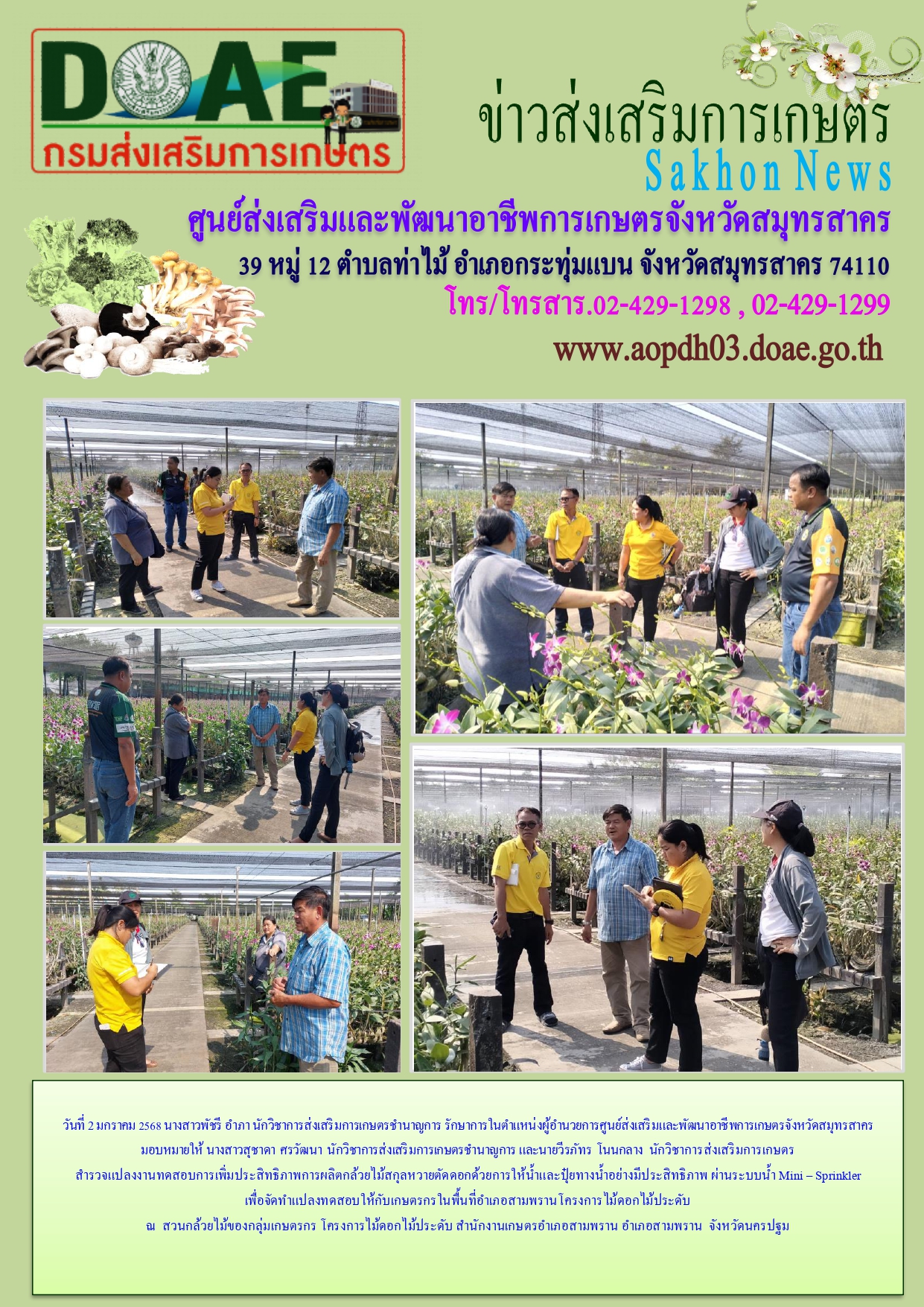 วันที่ 2 มค. 68 นส.พัชรี อำภา นวส.ชำนาญการ รักษาการในตำแหน่งผู้อำนวยการศูนย์ฯ มอบหมายให้ นส.สุชาดา ศรวัฒนา นวส.ชำนาญการ และนายวีรภัทร โนนกลาง นวส. สำรวจแปลงงานทดสอบการเพิ่มประสิทธิภาพการผลิตกล้วยไม้สกุลหวายตัดดอกด้วยการให้น้ำและปุ๋ยทางน้ำอย่างมีประสิทธิภาพ ผ่านระบบน้ำ Mini – Sprinkler เพื่อจัดทำแปลงทดสอบให้กับเกษตรกรในพื้นที่อำเภอสามพรานโครงการไม้ดอกไม้ประดับ