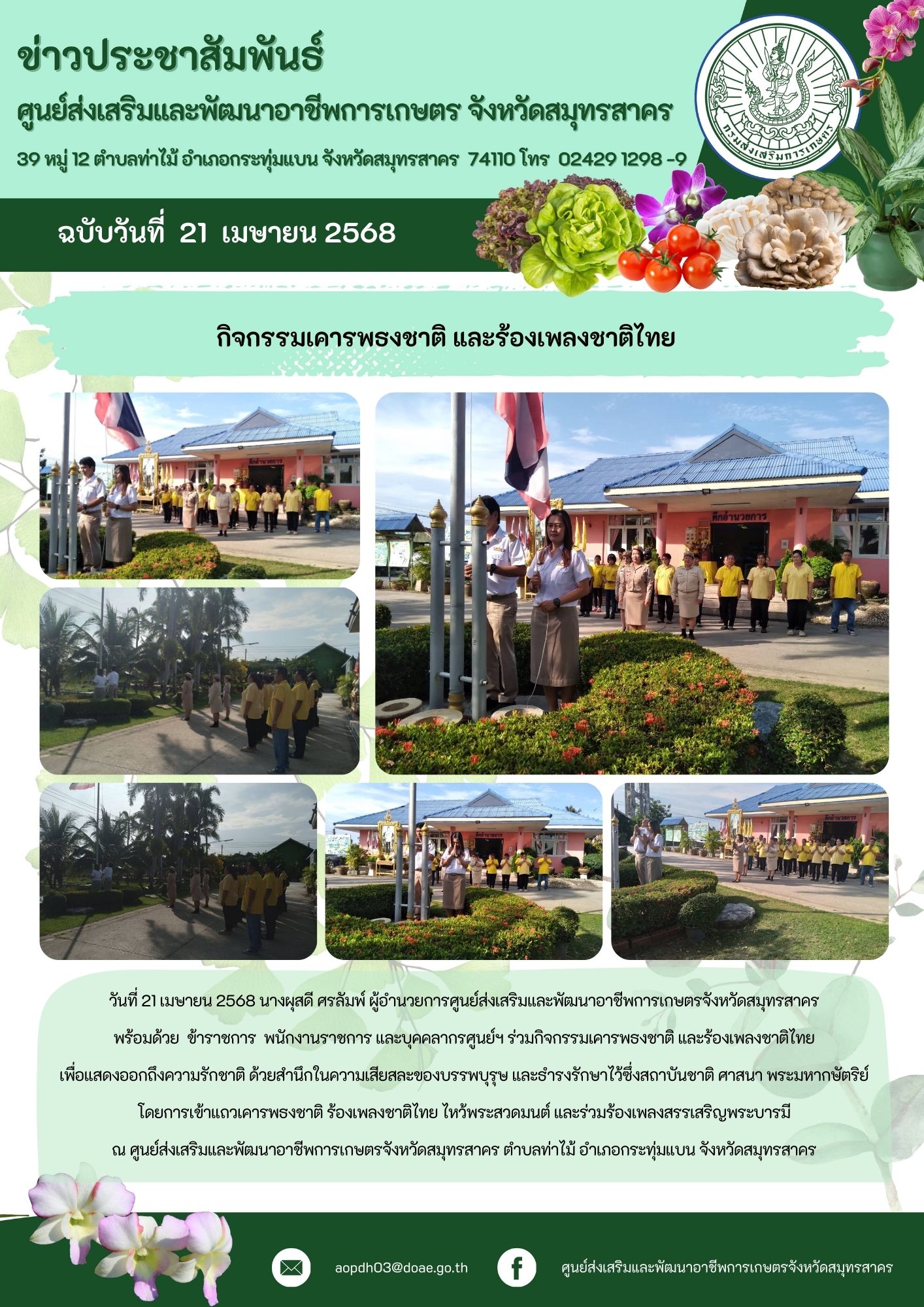 วันที่ 21 เมย. 68 นางผุสดี ศรลัมพ์ ผู้อำนวยการศูนย์ฯ พร้อมด้วย ข้าราชการ พนักงานราชการ และบุคคลากรศูนย์ฯ ร่วมกิจกรรมเคารพธงชาติ และร้องเพลงชาติไทย เพื่อแสดงออกถึงความรักชาติ ด้วยสำนึกในความเสียสละของบรรพบุรุษ และธำรงรักษาไว้ซึ่งสถาบันชาติ ศาสนา พระมหากษัตริย์ โดยการเข้าแถวเคารพธงชาติ ร้องเพลงชาติไทย ไหว้พระสวดมนต์ และร่วมร้องเพลงสรรเสริญพระบารมี